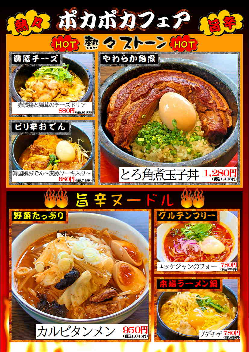 お知らせ News 焼肉乃上州 2025.11.1 ポカポカフェアの季節がやってきました♪ だんだんと寒くなってきてあたたかい料理がおいしい季節になりましたね(*‘ω‘ *)昨年も好評だったポカポカフェアが帰ってきました(*'ω'*)熱々旨辛な料理が胃も心も満足させてくれること間違いなしです(^_-)-☆ぜひおためしくださいね(*‘∀‘) 前の記事 次の記事 記事一覧