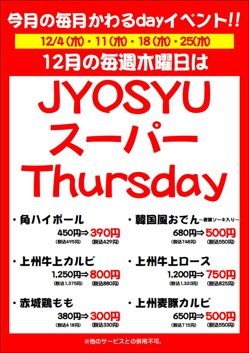 お知らせ News 焼肉乃上州 2025.12.3 12月のスーパーThursdayは… 今月は当店人気メニューから6品を厳選!お得な価格でご提供しますっ(*'ω'*)ぜひ、おでかけくださいねっ(^_-)-☆スタッフ一同お待ちしておりまぁす(*‘∀‘) 前の記事 次の記事 記事一覧
